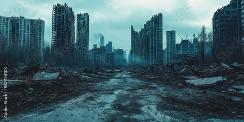 A desolate urban landscape showcasing abandoned buildings and a barren road, conveying a feeling of post-apocalyptic decay.