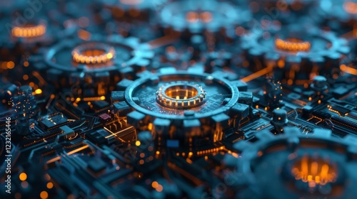 gear, circuit, technology, night, glow, intricate, futuristic, network, ambience, machinery, design, lighting, innovation, connection, digital, detail, environment, engineering, abstract, illumination, industrial, pattern, blue, orange, hardware, mechanic, science, system, electronic, modern, visualisation, aesthetic, geometry, background, energy, complexity, structure, visual, art, creativity, exploration, tech, depth, craftsmanship, metallic, manipulation, dynamic, generative, ai