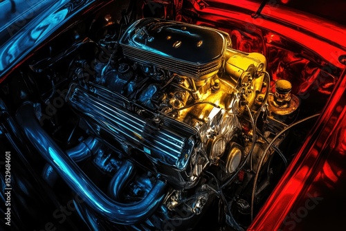 garage mechanic, automotive, classic car, muscle car, hot rod, piston, cylinder, crankshaft, carburetor, coolant, wire, hose, transmission, detailed, closeup, macro, photo, vehicle, automobile, transportation, speed, power, performance, machinery, technology, metallic, shiny, colours, dark, night, vibrant