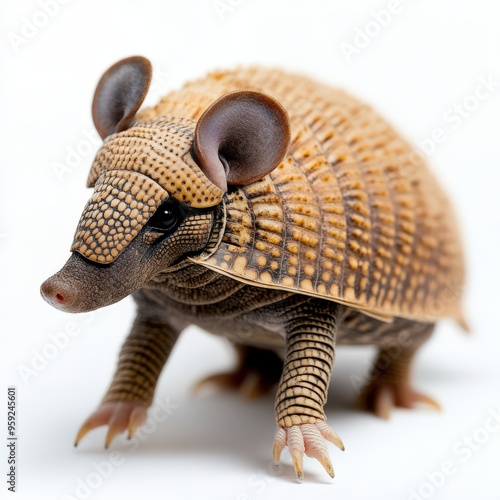 A detailed close-up of an armadillo showcasing its unique texture and features against a soft backdrop.
