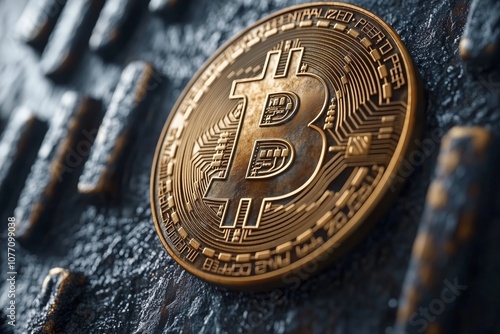 A detailed close-up shot of a Bitcoin coin resting on a rough, textured surface.