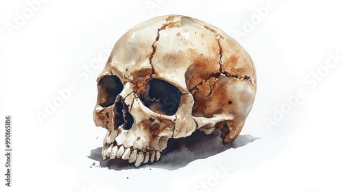 A detailed depiction of a cracked human skull resting on a white surface, showcasing intricate textures and shadows under soft lighting
