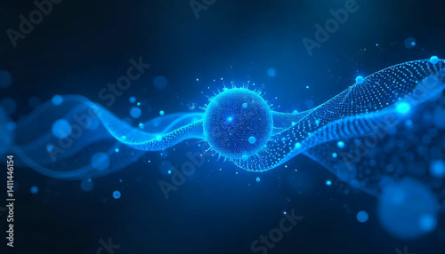 A detailed illustration of a blue virus cell connected to a glowing network structure