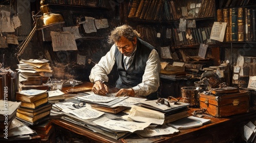 A Detailed Study of a Man Writing at His Antique Desk in a Historical Library
