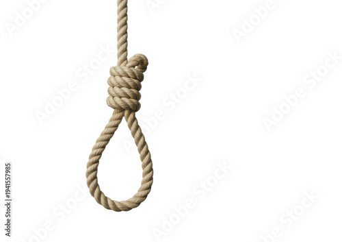 A detailed view of a rope with a knot tied at the end, hanging freely in midair. isolated on transparent background