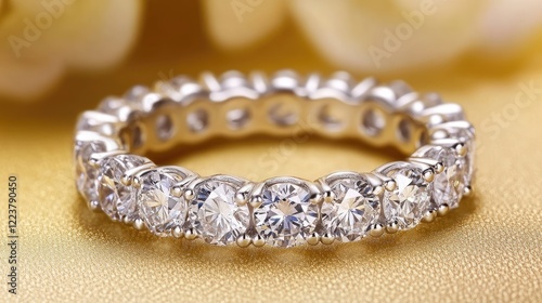 A diamond eternity ring with tiny sparkling gems, displayed on a champagne satin background.