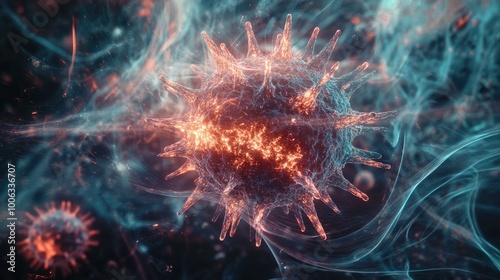 A digital representation of a virus, with sharp spikes and a glowing center, set against a deep, abstract background of swirling particles.