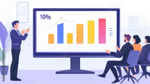 A digital screen in a meeting room displaying a bar graph with growth from 0 to 100. The room is filled with happy professionals applauding the results.