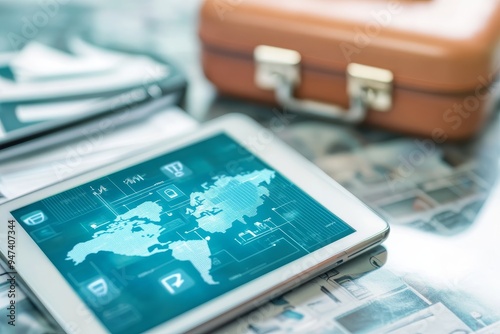 A digital travel insurance policy displayed on a tablet, with travel documents and a suitcase in the background, symbolizing the ease of managing travel coverage through