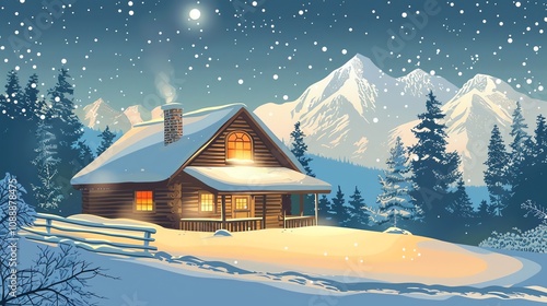 cabin, winter, snow, mountain, forest, tree, landscape, cosy, nature, outdoors, peaceful, beautiful, snowy, holiday, christmas, vacation, travel, illustration, design, art, graphic, background, night, moon, star, night sky