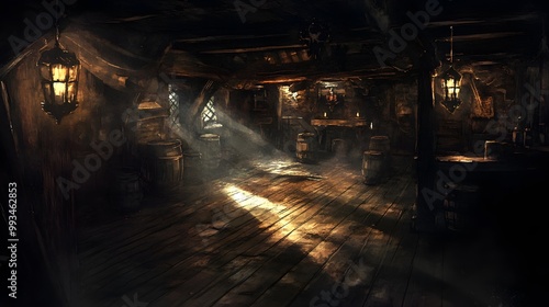 dimly, lit, pirate, tavern, long, eerie, shadow, across, wooden, floor, lantern, flicker, watercolor, style, rough, texture, beam, creaky, floorboard, while, shadowy, figure, lurk, corner, skittish, mysterious, atmosphere