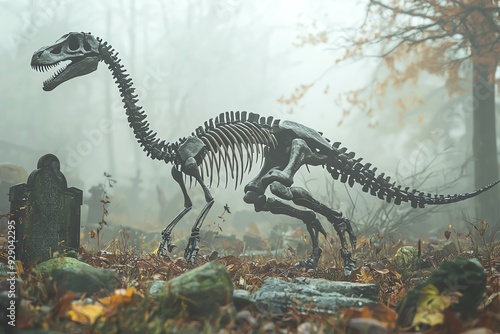 A dinosaur skeleton stands majestically in a misty forest, surrounded by autumn leaves and ancient gravestones.