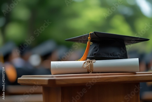A diploma and graduation cap resting on a podium, symbolizing achievement and the culmination of years of hard work