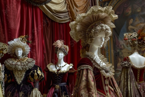 A display of vintage mannequin clothing, including a woman's dress and hat