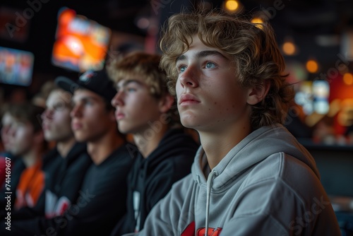 A diverse group of fashionable young men and women sitting together on a busy city street, their faces lit up with laughter and conversation as they enjoy the warm outdoor weather in their stylish cl