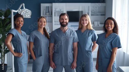 A diverse group of medical professionals, including three women and one man, smiling confidently in scrubs.