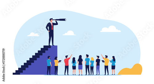 A diverse group of people looking up at a leader using a telescope on stairs.