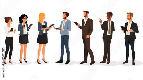 A diverse group of professionals engaging in discussion with digital devices in a modern business setting.