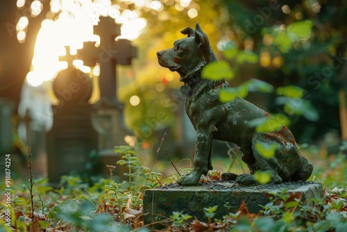 A dog guarding a grave courageously in a cemetery