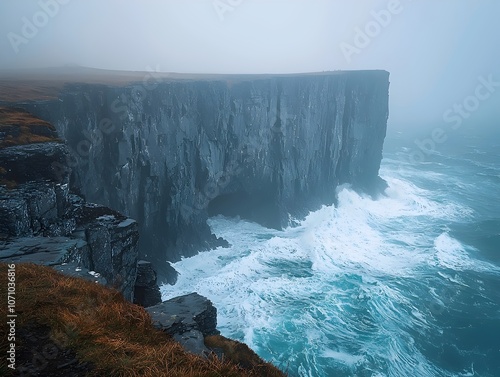 A dramatic coastal cliff in misty conditions, showcasing jagged rock formations and crashing waves below, creating a serene yet powerful atmosphere.