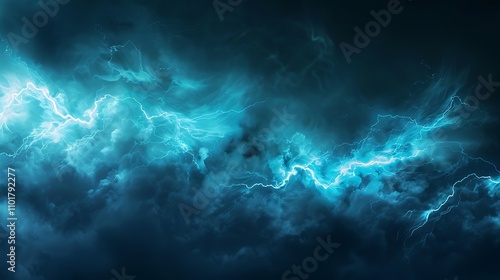 A dramatic depiction of stormy clouds illuminated by bright blue lightning, evoking a sense of power and nature's fury.