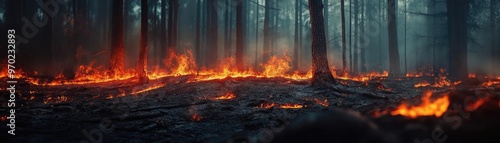 A dramatic forest scene with raging flames illuminating the dark trees, showcasing the destructive power of wildfire in nature.