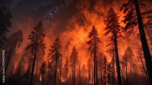 A dramatic scene of a forest fire at night,
