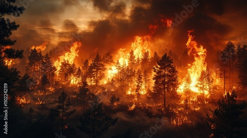A dramatic scene of a forest fire engulfing trees, illustrating the impact of wildfires.