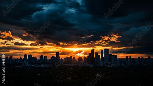 A dramatic sunset over a city skyline, with dark clouds and illuminated buildings creating a striking contrast.