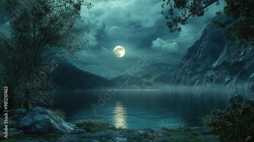 dreamlike, scene, lake, illuminated, moonlight, night, water, calm, serene, nature, landscape, tranquility, beauty, sky, star, illumination, mystical, peaceful, atmospheric, dream, glow, shimmering, night time, waterscape, dark, stillness, fantasy, silence, environment, dusk