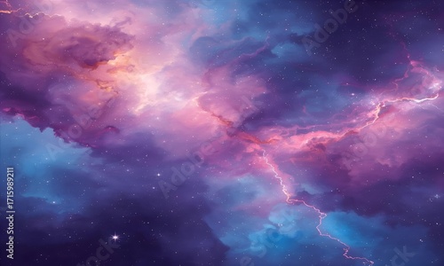 A dreamy cosmic style background with purple, blue, and pink nebula clouds, soft stars, and glowing energy flow.
