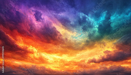 A dreamy sky transitioning from a golden sunset to a full spectrum of rainbow colors, giving off a vibrant yet calming feel