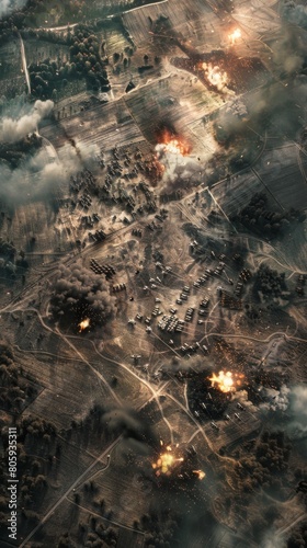 A drones-eye view of a battlefield highlighting troop movements explosions and the overall scope of conflict