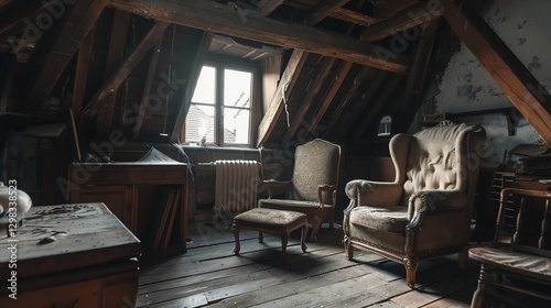 attic, abandoned, room, interior, design, house, old, vintage, rustic, dust, chair, desk, window, light, dark, empty, creepy, haunted, gloomy, forgotten