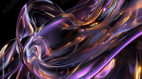 A dynamic and abstract representation of flowing intertwined metallic or glasslike structures These structures exhibit a shimmering iridescent quality with hues of purple gold and black They appear to