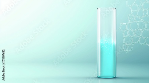 A dynamic design with a glowing test tube emitting light blue particles