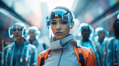 futuristic, fashion, trend, clothing, style, group, people, dynamic, model, runway, futurism, innovation, technology, chic, ensemble, avant-garde, catwalk, extravagant, glamourous, haute couture, ultramodern, edgy, unique, forward-looking, visionary, cutting edge, bold, contemporary, experimental, science fiction, robotic, metallic, sleek, aesthetic, radical, unconventional, daring, imaginative
