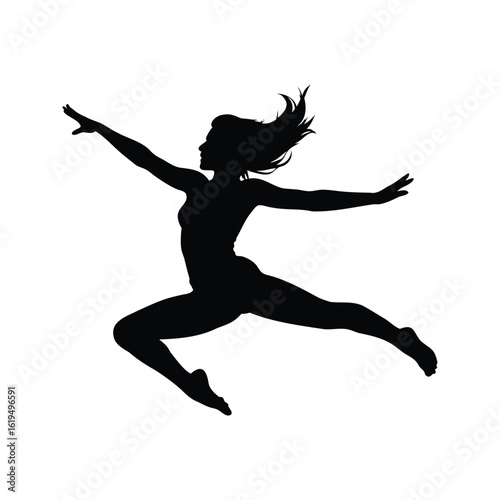 silhouette, woman, dance, gymnast, athletic, fitness, pose, movement, black-and-white, sport, performance, acrobat, leap, jumping, female, artistic, expression, energy, dynamic, action, figure, body, human, illustration, art, design, graphic, freedom, active, exercising, modern dance, creative, expressive