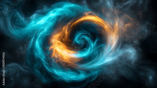 A dynamic swirl of vibrant cyan and amber hues blending seamlessly with a misty texture, evoking a sense of energy and depth, set against a smoky black.