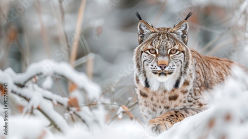 A Eurasian lynx in a snowy winter forest, capturing the wild beauty of nature.