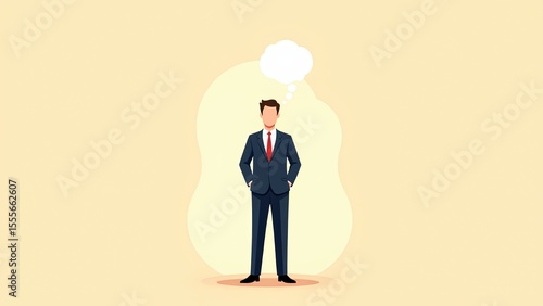 A faceless businessman in a formal suit stands thinking with a blank thought bubble. Modern flat vector illustration for business concepts, ideas, plann