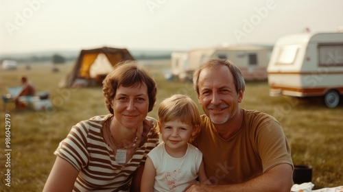 A family of three poses cheerfully in the countryside near their caravan, surrounded by scenic tents and caravans, experiencing leisure and connection in nature.
