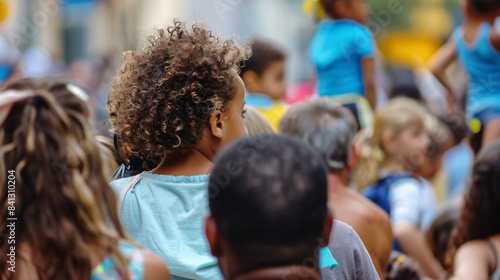 A family watching a parade, with children sitting on their parents' shoulders to get a better view