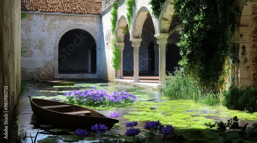 A fantasy landscape with a garden and pond. A 3D illustration of an ancient stone city with gardens and ponds.