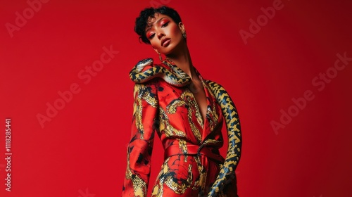 A fashionable individual showcases a bold jumpsuit embellished with intricate patterns, while a snake wraps elegantly around their arm, set against a vivid red background