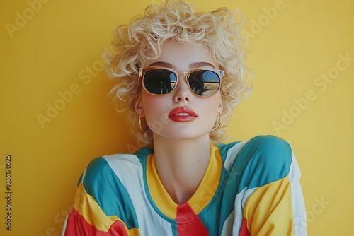 woman, curly, hair, blond, sunglasses, fashion, style, portrait, vibrant, yellow, background, high-coloured, colours, trendy, casual attire, outfit, posing, beauty, cheerful, youthful, confident, clothing, accessory, make-up, modern, expression, urban, lifestyle, summer, leisure, fashionable, look, aesthetic, colourful, glamourous, sunny, indoor, fun, creative, stylish, head shot, eyeglass, shot