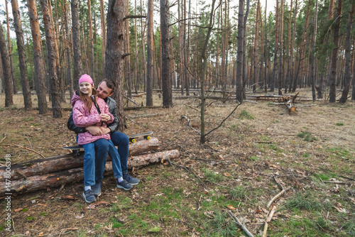 A father and daughter with skateboards are relaxing on a log in the forest.