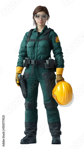 A female character in a green jumpsuit with safety gear, holding a helmet, representing a worker in an industrial or construction setting.