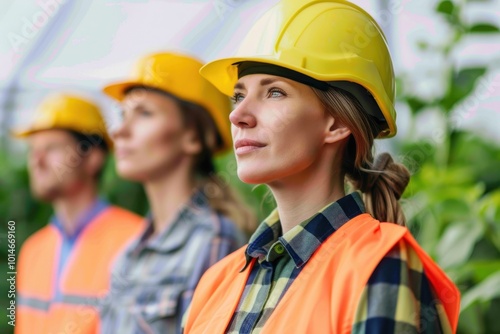 A female construction worker wearing a hard hat and safety vest looks forward confidently while standing alongside colleagues in a green outdoor setting.