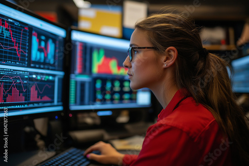 A female data scientist works diligently on multiple computer screens, displaying graphs and charts and various analytics in a modern work environment.